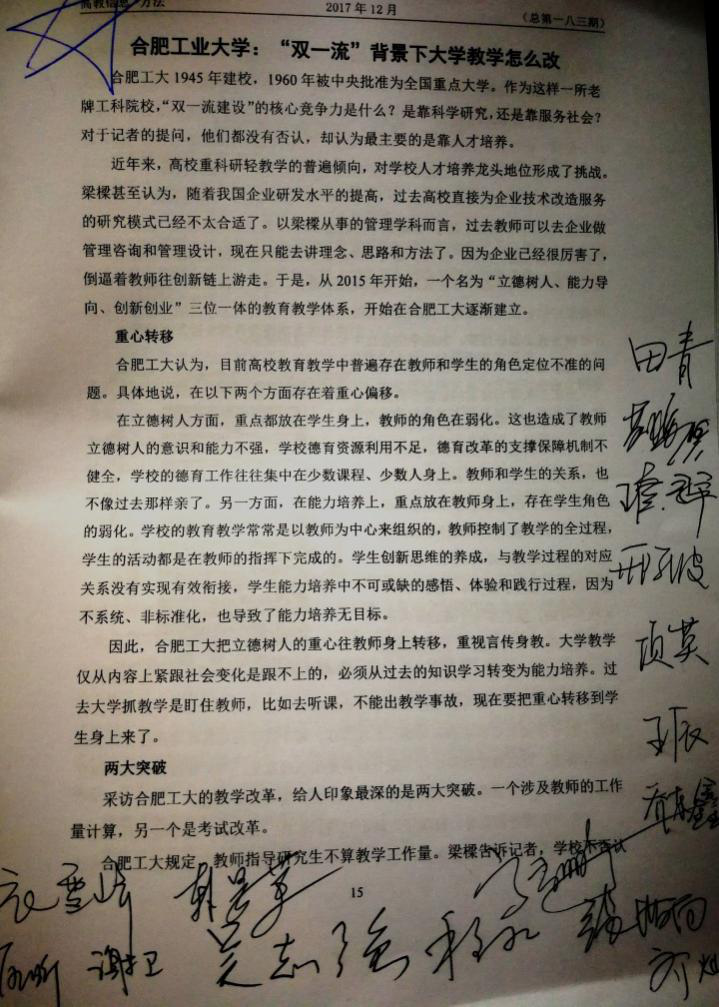 田青院长首先带全体老师一起回顾学习了15号学校党委校庆通报会的会议精神。随后董梅副院长带领大家一起学习《高教信息》上的文章《合肥工业大学:“双一流”背景下大学教学怎么改》。在如何响应学校国际化倡导,以及“双一流”背景下大学教学改革等问题上,学院教师展开了热烈讨论。