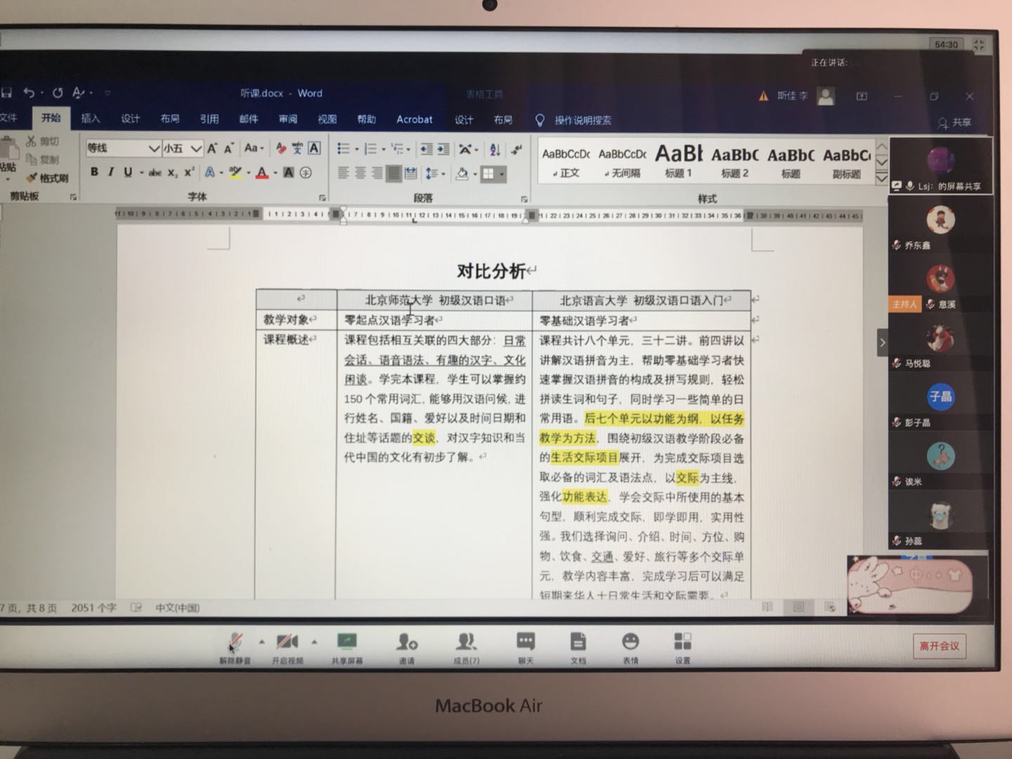 在居家防疫大环境下,线上学习成为最主要的教学方式。教育实习的听课观摩也搬到了线上。指导教师通过建立实习微信群,布置实习安排,明确实习要求,并提供学习视、听、音、影资源。学生利用互联网等现代教育技术手段,查阅国际汉语教学理论、教学设计、教学案例等方面的文献资料;通过超星、中国大学MOOC、学堂在线等慕课平台体验网络汉语课程教学模式;观摩优酷、哔哩哔哩等视频网站的中外汉语教学视频实录;研究各级各类各课型教材编写体例、特点特色等,开阔视野,积累教学体悟。