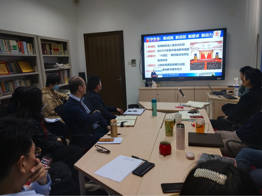 董梅副院长传达了吴岩司长的主题报告精神,即要把握新发展阶段,把新发展理念贯穿高等教育改革发展全过程和各领域,全面落实立德树人根本任务,抓好专业质量、课程质量、教材质量和技术水平,加快构建高等教育高质量发展体系。与会老师还一起观看了吴司长的讲话视频。