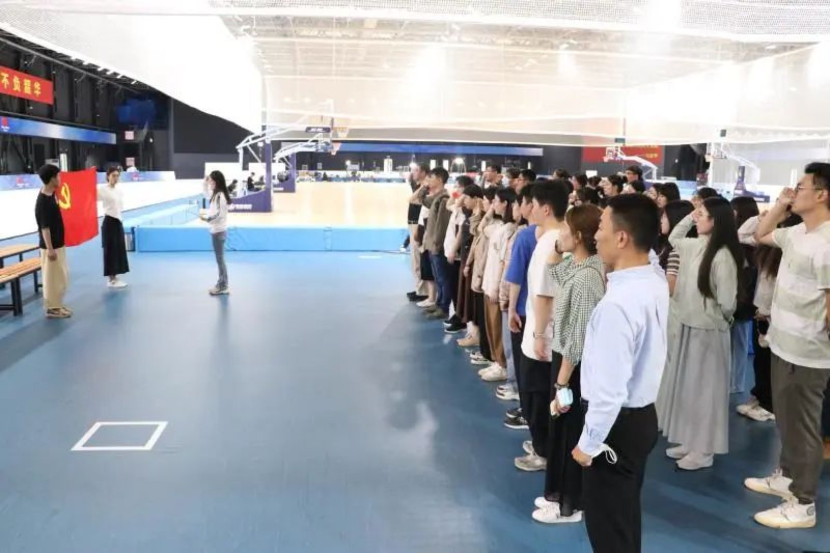 接下来,在负责人的带领下,我院一行人继续重走总书记考察之路。“同我们国家的强国之路一样,中国冰雪运动也必须走科技创新之路,一方面要坚持自主创新,一方面要善于吸收国际上的先进技术和训练方法。——习近平”从六自由度馆的多功能训练系统设施和内容到综合风洞馆的第一套实验测试风洞设备、滑雪训练风洞和风洞实验室再到阿比特室内滑雪馆再到速滑馆内全球第二套、国内首套Swiss Timing奥运计时计分及训练比赛系统和馆内设施对运动员能力提升所能起到的帮助作用,不论是训练设备还是科研设备,都给一路走来的大家带来了很多收获。在这个特殊的地方,我们重温了习近平总书记考察调研时留下的重要思想指示。在2022冬奥会与冬残奥会国家体育馆志愿者李瑾的带领下,全体党员重温入党誓词,再次回顾加入中国共产党时的心潮澎湃与坚定信念。