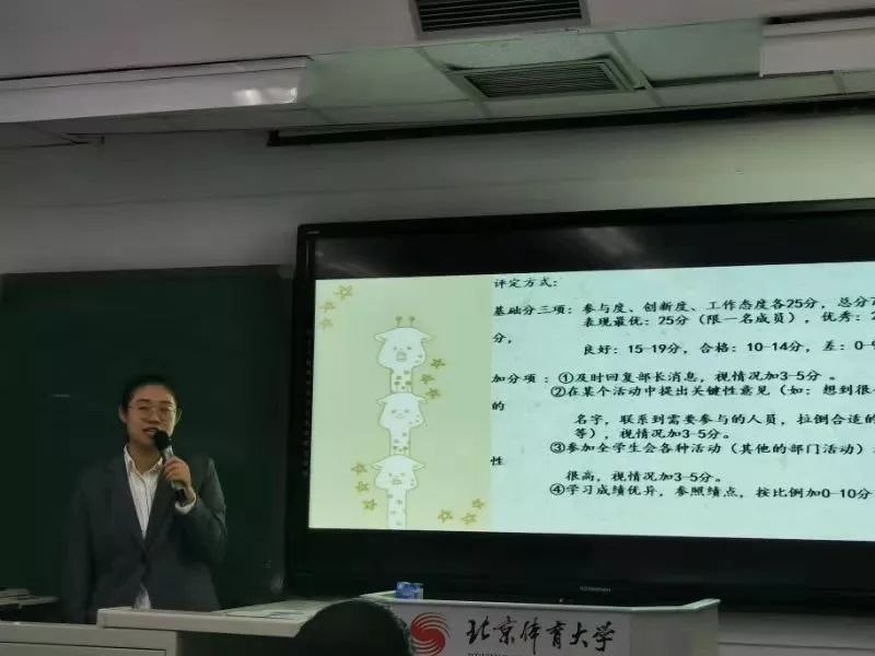 副主席王思雨详细介绍了学生会关于部员的评优标准。她着重强调了部员应该积极配合部长完成各项工作,也指出各位同学要努力学习,提高绩点,严格要求自己,不能因为学生会的工作就放低对成绩的要求。