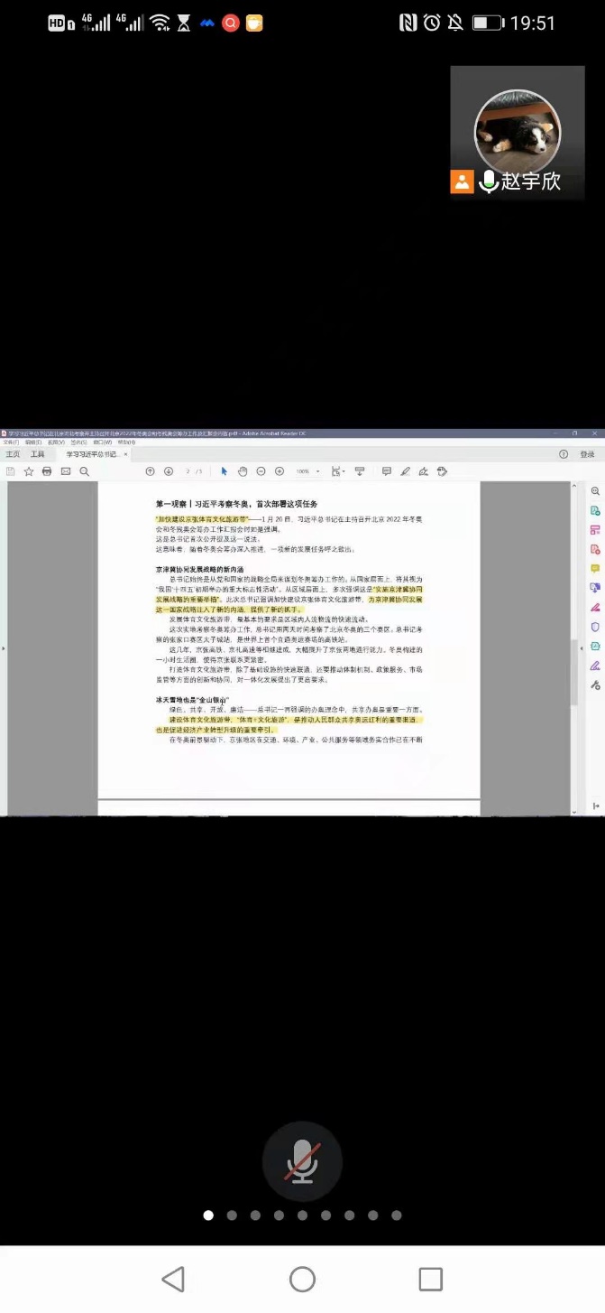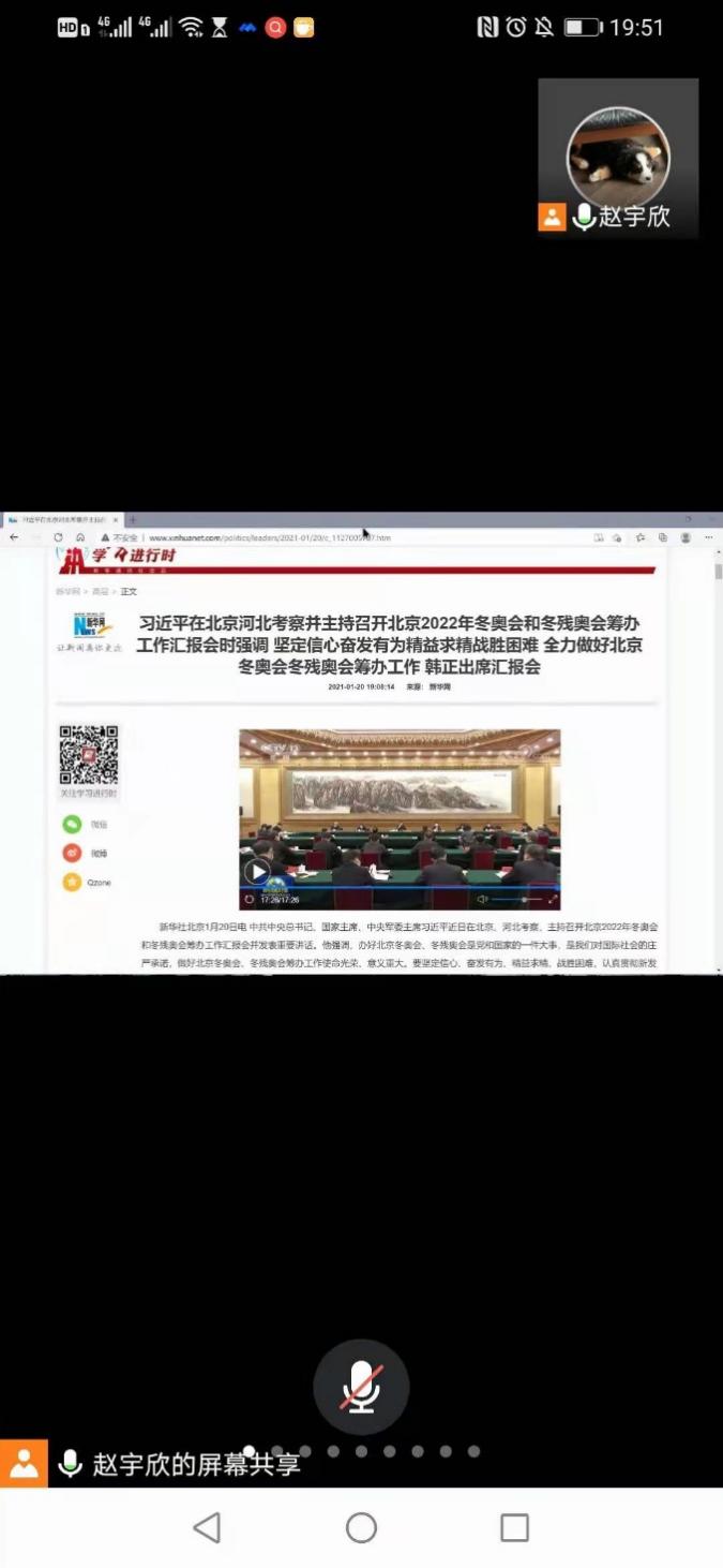 2021年1月24日晚,2019级2班团支部围绕习近平总书记在北京河北考察并主持召开北京2022年冬奥会和冬残奥会筹办工作及汇报会的内容在腾讯会议上召开了集体线上学习活动。此次活动由团支书赵宇欣主持。