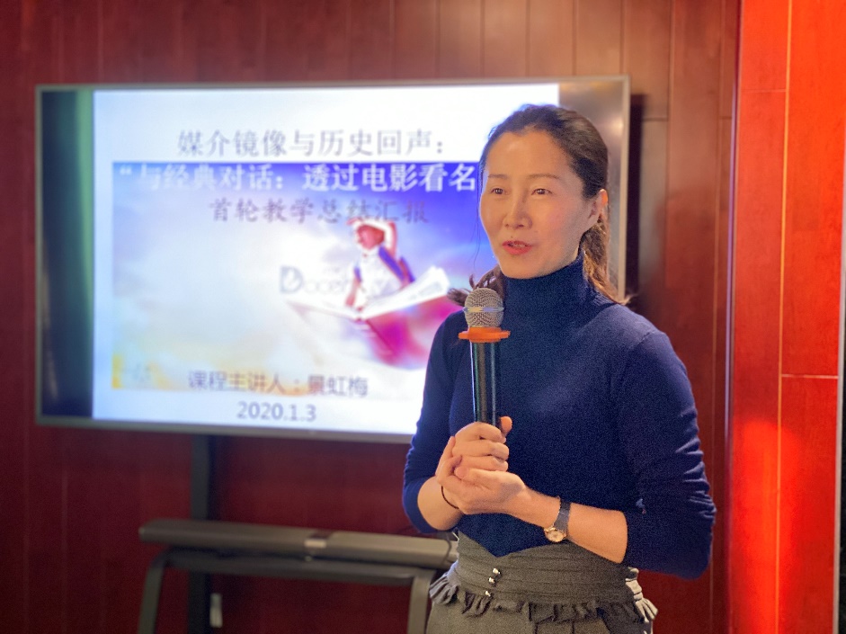 景虹梅副教授的汇报主题是“媒介镜像与历史回声:‘与经典对话:透过电影看名著’首轮教学总结”,阐述了该门课程如何通过文学原著和电影改编版本的“对比”,建立跨媒介、跨时代和跨文化的“对话”,并强调应该让学生带着问题去“看”,去思考,通过经典作品中伟大的作家、艺术家的发现,启发和打开学生感受和理解世界、人生、人性之奥妙的触角和视野,使之更敏锐、更广阔、更深远。